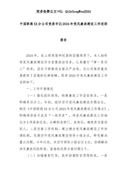 【七哥公文】2025年:中国联通XX分公司党委书记2024年党风廉政建设工作述职报告+更多免费公文+VX:QiGeGongWen2024+更多免费公文+VX:QiGeGongWen2024