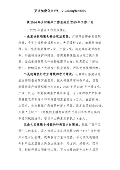 【七哥公文】2025年:镇2024年乡村振兴工作总结及2025年工作计划+更多免费公文+VX:QiGeGongWen2024+更多免费公文+VX:QiGeGongWen2024
