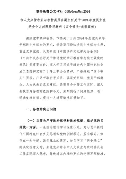 【七哥公文】2025年:市人大分管农业与农村委员会副主任关于2024年度民主生活会个人对照检视材料(四个带头+典型案例)+更多免费公文+VX:QiGeGongWen2024+更多免费公文+VX:QiGeGongWen2024