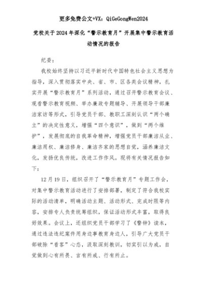 【七哥公文】2025年:党校关于2024年深化“警示教育月”开展集中警示教育活动情况的报告+更多免费公文+VX:QiGeGongWen2024+更多免费公文+VX:QiGeGongWen2024