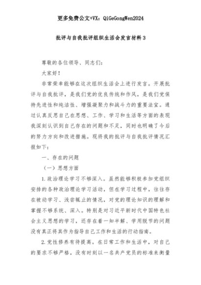 【七哥公文】2025年:批评与自我批评组织生活会发言材料3+更多免费公文+VX:QiGeGongWen2024+更多免费公文+VX:QiGeGongWen2024