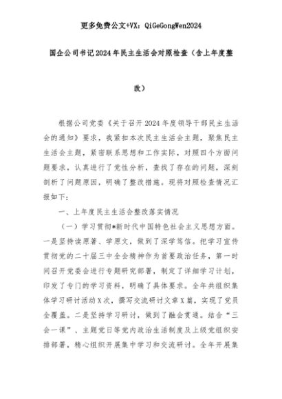 【七哥公文】2025年:国企公司书记2024年民主生活会对照检查(含上年度整改)+更多免费公文+VX:QiGeGongWen2024+更多免费公文+VX:QiGeGongWen2024