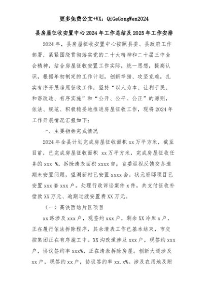 【七哥公文】2025年:县房屋征收安置中心2024年工作总结及2025年工作安排+更多免费公文+VX:QiGeGongWen2024+更多免费公文+VX:QiGeGongWen2024
