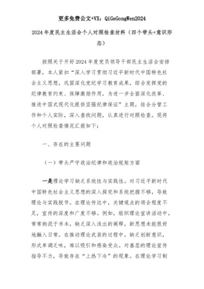 【七哥公文】2025年:2024年度民主生活会个人对照检查材料(四个带头+意识形态)+更多免费公文+VX:QiGeGongWen2024+更多免费公文+VX:QiGeGongWen2024
