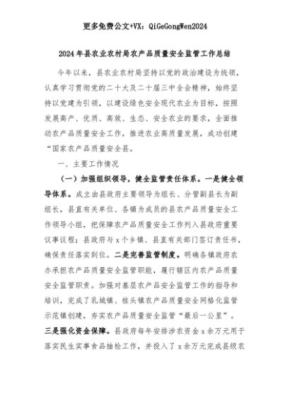 【七哥公文】2025年:2024年县农业农村局农产品质量安全监管工作总结+更多免费公文+VX:QiGeGongWen2024+更多免费公文+VX:QiGeGongWen2024