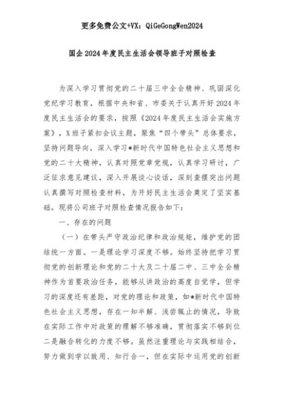 【七哥公文】2025年:国企2024年度民主生活会领导班子对照检查+更多免费公文+VX:QiGeGongWen2024+更多免费公文+VX:QiGeGongWen2024
