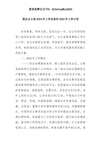 【七哥公文】2025年:国企办公室2024年工作总结和2025年工作计划+更多免费公文+VX:QiGeGongWen2024+更多免费公文+VX:QiGeGongWen2024