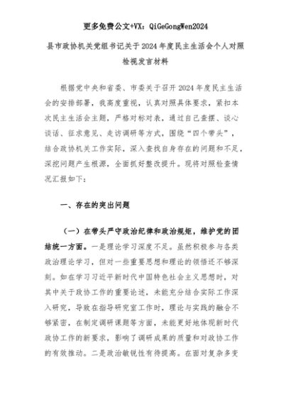 【七哥公文】2025年:县市政协机关党组书记关于2024年度民主生活会个人对照检视发言材料+更多免费公文+VX:QiGeGongWen2024+更多免费公文+VX:QiGeGongWen2024