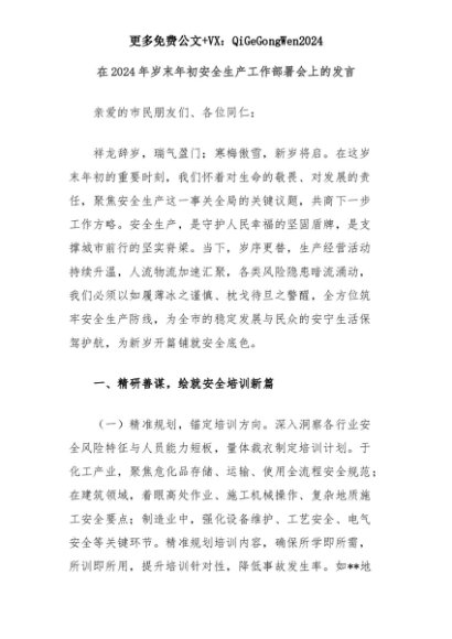 【七哥公文】2025年:在2024年岁末年初安全生产工作部署会上的发言+更多免费公文+VX:QiGeGongWen2024+更多免费公文+VX:QiGeGongWen2024