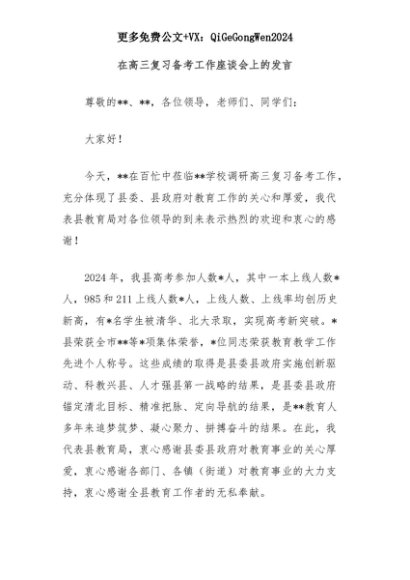 【七哥公文】2025年:在高三复习备考工作座谈会上的发言+更多免费公文+VX:QiGeGongWen2024+更多免费公文+VX:QiGeGongWen2024