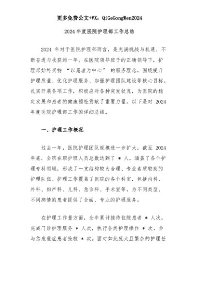 【七哥公文】2025年:2024年度医院护理部工作总结+更多免费公文+VX:QiGeGongWen2024+更多免费公文+VX:QiGeGongWen2024