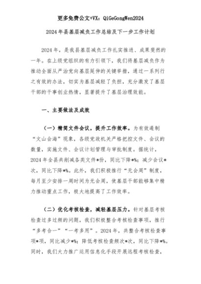 【七哥公文】2025年:2024年县基层减负工作总结及下一步工作计划+更多免费公文+VX:QiGeGongWen2024+更多免费公文+VX:QiGeGongWen2024