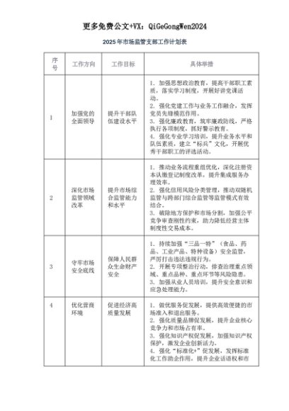 【七哥公文】2025年:2025年市场监管支部工作计划表_+更多免费公文+VX:QiGeGongWen2024+更多免费公文+VX:QiGeGongWen2024