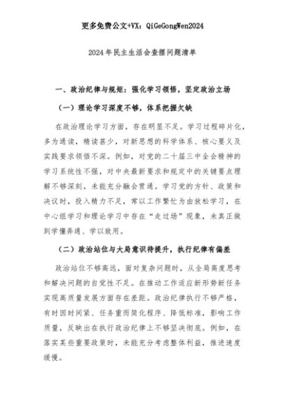 【七哥公文】2025年:2024年民主生活会查摆问题清单+更多免费公文+VX:QiGeGongWen2024+更多免费公文+VX:QiGeGongWen2024