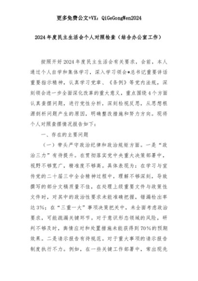 【七哥公文】2025年:2024年度民主生活会个人对照检查(结合办公室工作)+更多免费公文+VX:QiGeGongWen2024+更多免费公文+VX:QiGeGongWen2024