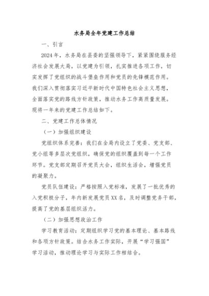 / 【七哥公文】2024年:水务局全年党建工作总结 (1)+更多免费公文+VX:QiGeGongWen2024