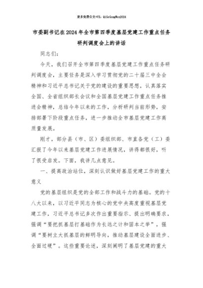 【七哥公文】2024年:市委副书记在2024年全市第四季度基层党建工作重点任务研判调度会上的讲话+更多免费公文+VX:QiGeGongWen2024