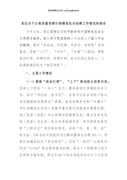 【七哥公文】2024年:某区关于以高质量党建引领模范机关创建工作情况的报告+更多免费公文+VX:QiGeGongWen2024