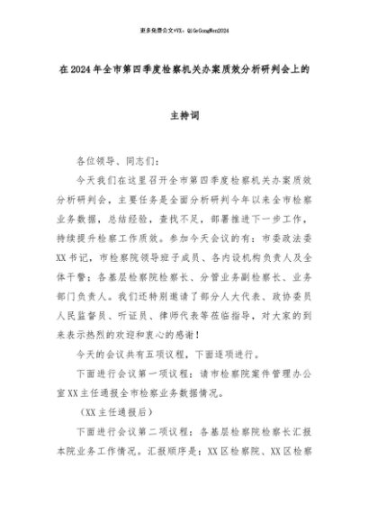 【七哥公文】2024年:在2024年全市第四季度检察机关办案质效分析研判会上的主持词+更多免费公文+VX:QiGeGongWen2024