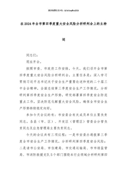 【七哥公文】2024年:在2024年全市第四季度重大安全风险分析研判会上的主持词+更多免费公文+VX:QiGeGongWen2024