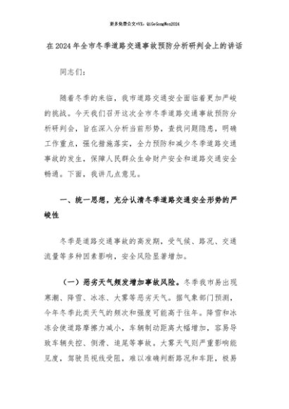 【七哥公文】2024年:在2024年全市冬季道路交通事故预防分析研判会上的讲话+更多免费公文+VX:QiGeGongWen2024