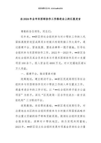 / 【七哥公文】2024年:在2024年全市东西部协作工作推进会上的汇报发言+更多免费公文+VX:QiGeGongWen2024