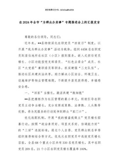 【七哥公文】2024年:在2024年全市“为群众办实事”专题推进会上的汇报发言+更多免费公文+VX:QiGeGongWen2024