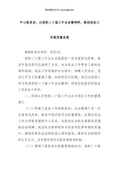 【七哥公文】2024年:中心组发言:以党的二十届三中全会精神研,推动政法工作高质量发展+更多免费公文+VX:QiGeGongWen2024