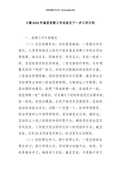 / 【七哥公文】2024年:X镇2024年基层党建工作总结及下一步工作计划+更多免费公文+VX:QiGeGongWen2024