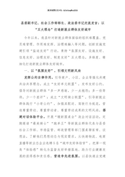 【七哥公文】2024年:县委副书记、社会工作部部长、政法委书记交流发言:以“五大理念”打造新就业群体友好城市+更多免费公文+VX:QiGeGongWen2024