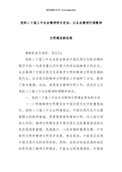 【七哥公文】2024年:党的二十届三中全会精神研讨发言:以全会精神引领精神文明建设新征程+更多免费公文+VX:QiGeGongWen2024
