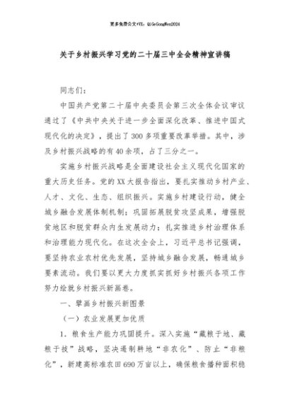 / 【七哥公文】2024年:关于乡村振兴学习党的二十届三中全会精神宣讲稿+更多免费公文+VX:QiGeGongWen2024