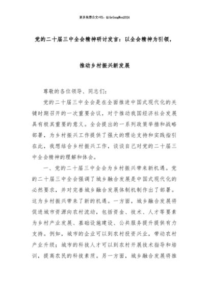 【七哥公文】2024年:党的二十届三中全会精神研讨发言:以全会精神为引领,推动乡村振兴新发展+更多免费公文+VX:QiGeGongWen2024