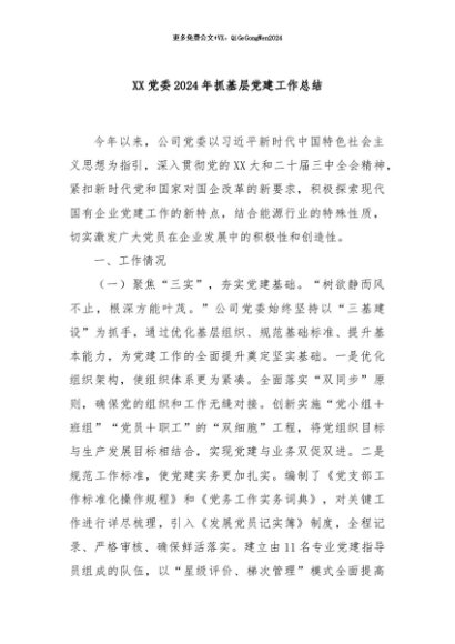 / 【七哥公文】2024年:XX党委2024年抓基层党建工作总结+更多免费公文+VX:QiGeGongWen2024