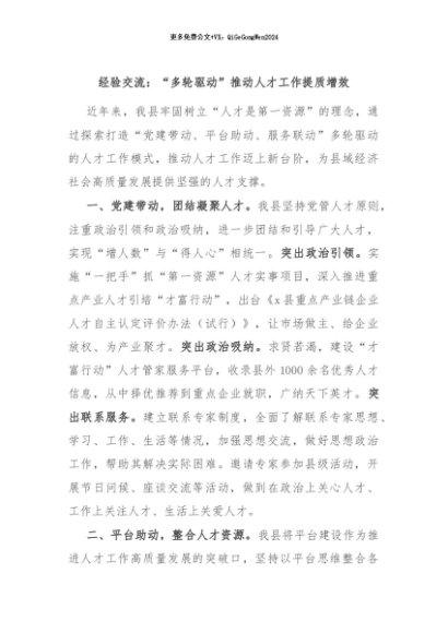 【七哥公文】2024年:经验交流:“多轮驱动”推动人才工作提质增效+更多免费公文+VX:QiGeGongWen2024