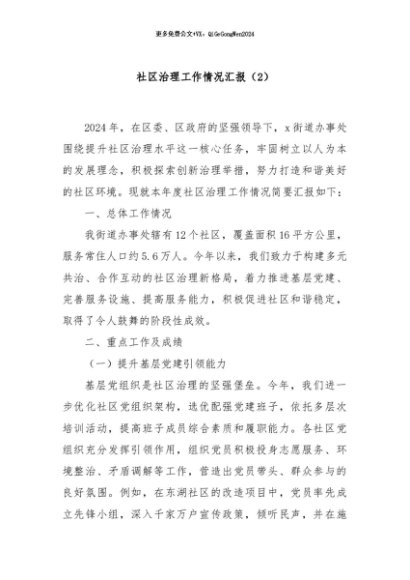 / 【七哥公文】2024年:社区治理工作情况汇报(2)+更多免费公文+VX:QiGeGongWen2024