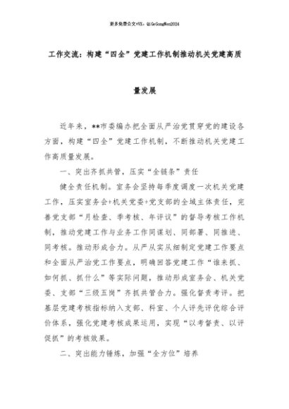 【七哥公文】2024年:工作交流:构建“四全”党建工作机制推动机关党建高质量发展+更多免费公文+VX:QiGeGongWen2024