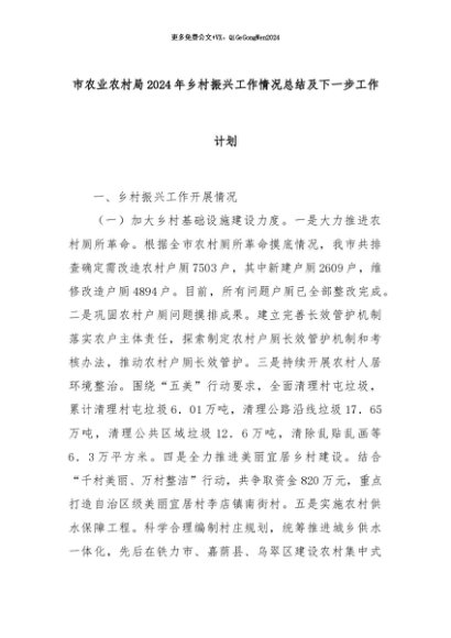 【七哥公文】2024年:市农业农村局2024年乡村振兴工作情况总结及下一步工作计划+更多免费公文+VX:QiGeGongWen2024