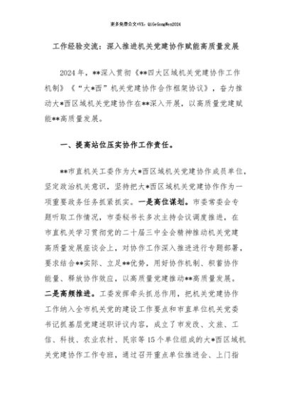 / 【七哥公文】2024年:工作经验交流:深入推进机关党建协作赋能高质量发展+更多免费公文+VX:QiGeGongWen2024