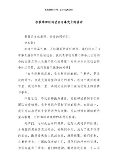 【七哥公文】2024年:在秋季田径运动会开幕式上的讲话+更多免费公文+VX:QiGeGongWen2024