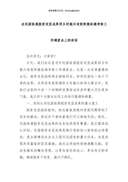 【七哥公文】2024年:在巩固拓展脱贫攻坚成果同乡村振兴有效衔接实绩考核工作调度会上的讲话+更多免费公文+VX:QiGeGongWen2024
