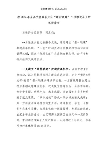【七哥公文】2024年:在2024年全县文旅融合片区“跨村联建”工作推进会上的汇报发言+更多免费公文+VX:QiGeGongWen2024