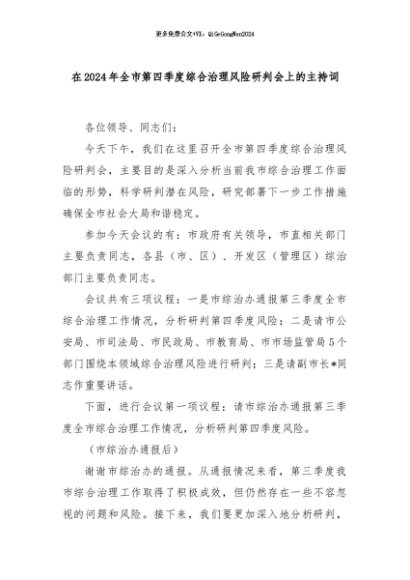 【七哥公文】2024年:在2024年全市第四季度综合治理风险研判会上的主持词+更多免费公文+VX:QiGeGongWen2024