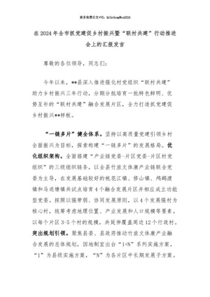 【七哥公文】2024年:在2024年全市抓党建促乡村振兴暨“联村共建”行动推进会上的汇报发言+更多免费公文+VX:QiGeGongWen2024
