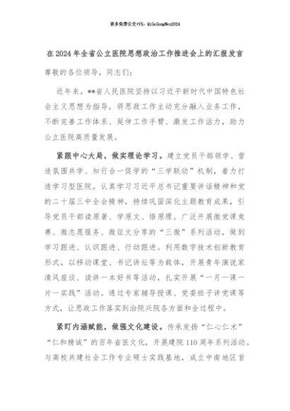 【七哥公文】2024年:在2024年全省公立医院思想政治工作推进会上的汇报发言+更多免费公文+VX:QiGeGongWen2024