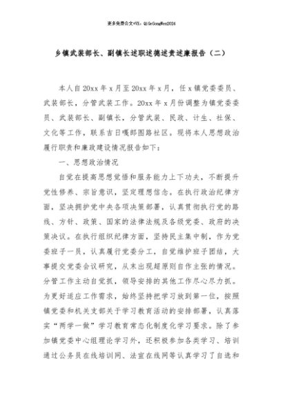 / 【七哥公文】2024年:乡镇武装部长、副镇长述职述德述责述廉报告(二)+更多免费公文+VX:QiGeGongWen2024