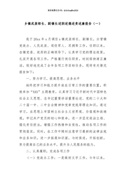 / 【七哥公文】2024年:乡镇武装部长、副镇长述职述德述责述廉报告(一)+更多免费公文+VX:QiGeGongWen2024