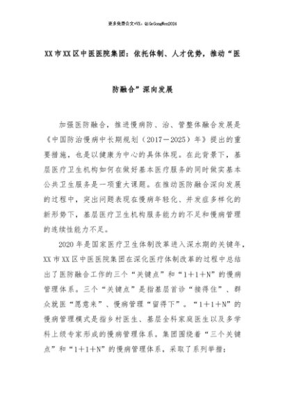【七哥公文】2024年:XX市XX区中医医院集团:依托体制、人才优势,推动“医防融合”深向发展+更多免费公文+VX:QiGeGongWen2024