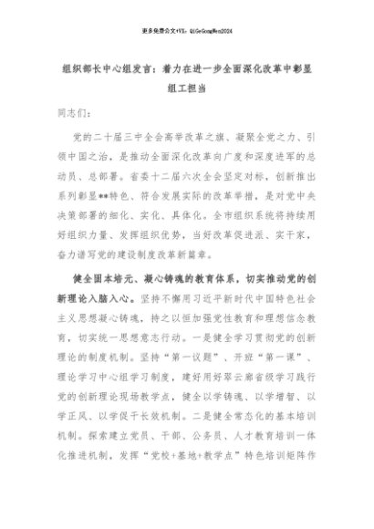 【七哥公文】2024年:组织部长中心组发言:着力在进一步全面深化改革中彰显组工担当+更多免费公文+VX:QiGeGongWen2024
