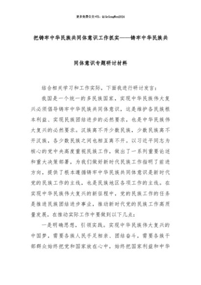 【七哥公文】2024年:把铸牢中华民族共同体意识工作抓实——铸牢中华民族共同体意识专题研讨材料+更多免费公文+VX:QiGeGongWen2024